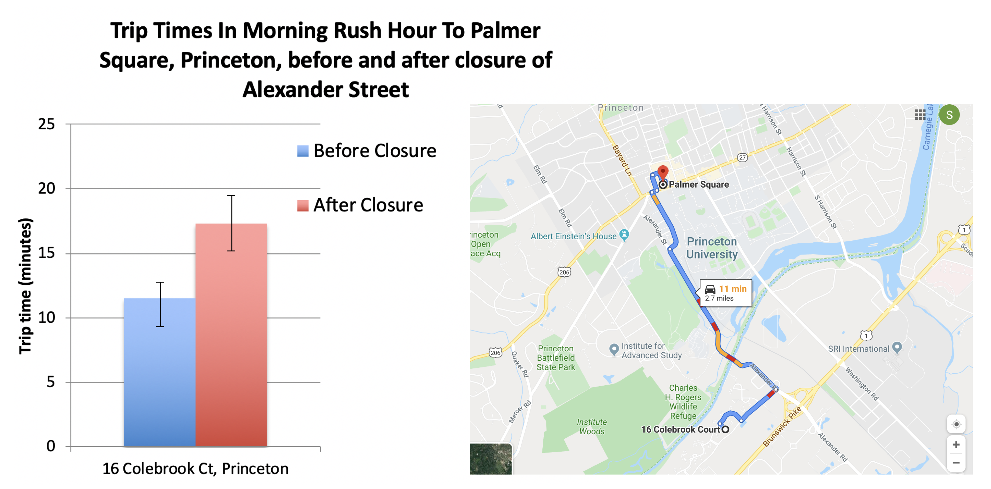 Trip times for travel between Colebrook Court (Canal Pointe Blvd neighborhood) into downtown Princeton, before and after closure of Alexander St in 2019 (click to expand)