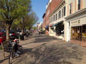 Nassau Street in Princeton has wide sidewalks, but pedestrians must squeeze together on most downtown sidewalks. (click to expand)