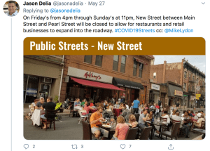 Councilman Jason Delia, explaining changes in the use of streets in downtown Metuchen as part of their COVID-19 Business Revitalization Strategy. (image via twitter.com, click to expand)