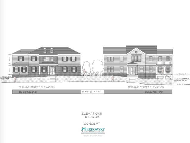 The new residences would be screened from existing homes on Grover Ave by a landscaped buffer. The apartment buildings would be visible from Terhune Road, and have design features similar to existing homes in the area (see rendering above). Nine parking spaces would be provided for the apartment buildings, and each townhouse would have a double-garage. Access would be via a new road, running on a municipal right-of-way along the south-west side of the site, perpendicular to Terhune Road, and parallel to Grover Ave. A 10-ft sidepath would run alongside this new road, connecting to the Princeton Shopping Center at the rear of the site. This new path would provide a direct connection to the Shopping Center for residents of Terhune Road and, in the future, for people living in the new housing that is proposed for Thanet Road.