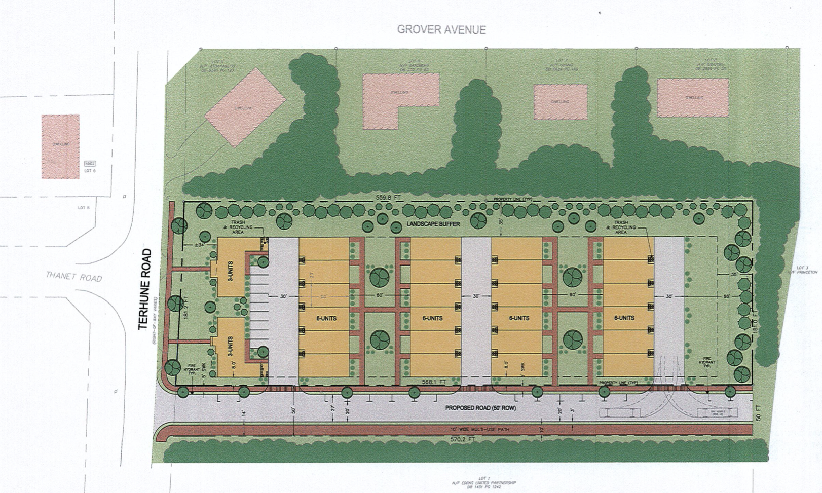The new residences would be screened from existing homes on Grover Ave by a landscaped buffer. The apartment buildings would be visible from Terhune Road, and have design features similar to existing homes in the area (see rendering above). Nine parking spaces would be provided for the apartment buildings, and each townhouse would have a double-garage. Access would be via a new road, running on a municipal right-of-way along the south-west side of the site, perpendicular to Terhune Road, and parallel to Grover Ave. A 10-ft sidepath would run alongside this new road, connecting to the Princeton Shopping Center at the rear of the site. This new path would provide a direct connection to the Shopping Center for residents of Terhune Road and, in the future, for people living in the new housing that is proposed for Thanet Road.