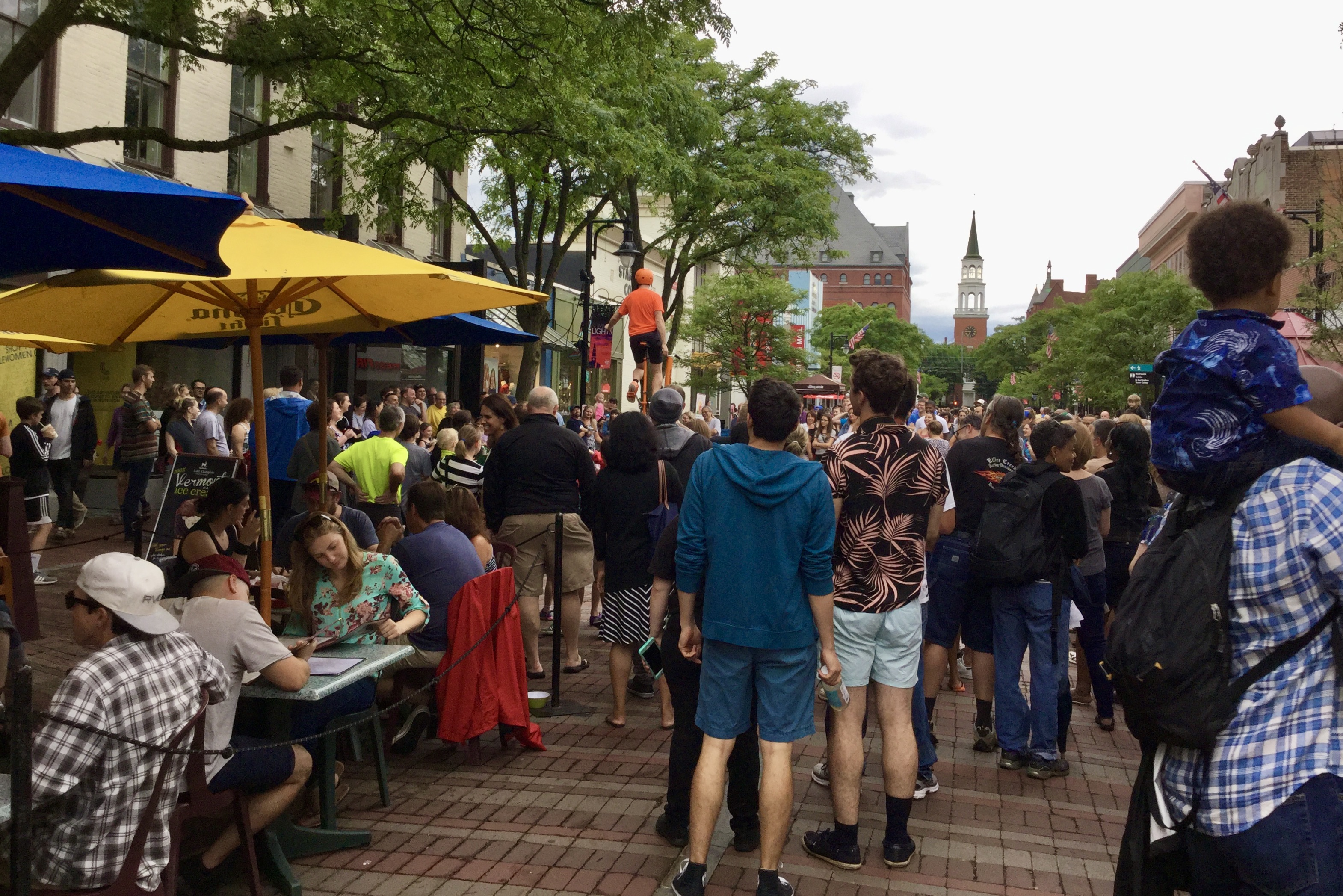 Crowds gather to watch a street performance at the Church Street Marketplace in Burlington VT (click to expand)