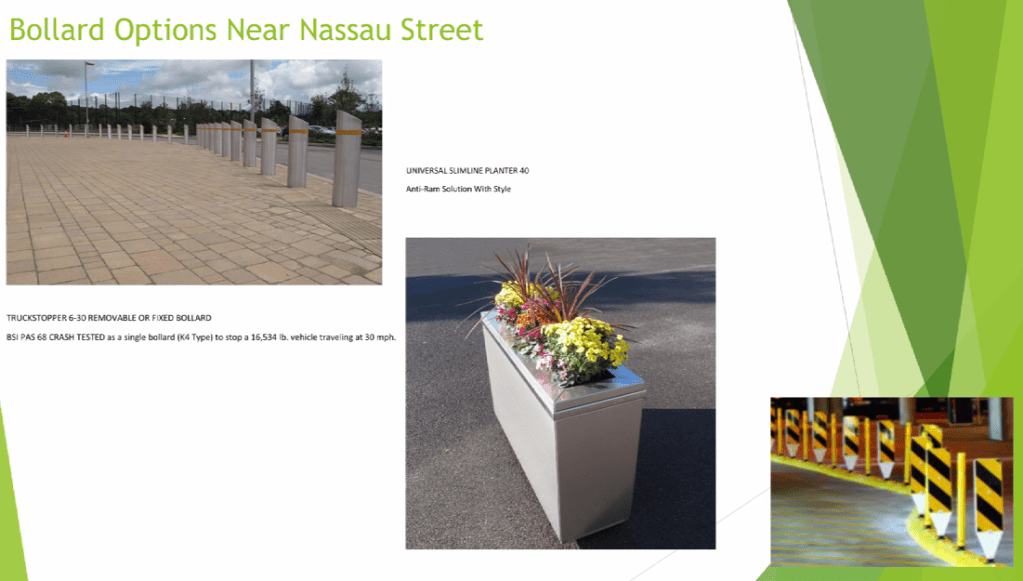 Street safety expert Lisa Serieyssol and local resident Tineke Theo expressed dismay about the sudden change in the plan. Chief municipal engineer Deanna Stockton and planner Michael LaPlace advised that they are considering options involving different types of bollards (see slide, at top, from engineers’ presentation), which might be used to ‘neck down’ Witherspoon St from a 22-ft width at the intersection at Nassau St to a 13.5-ft width further along the block. Some kind of bollards – potentially retractable bollards – might also be used to dedicate the blocks of Witherspoon St in the Central Business District as a pedestrian plaza either seasonally or on weekends / special occasions.