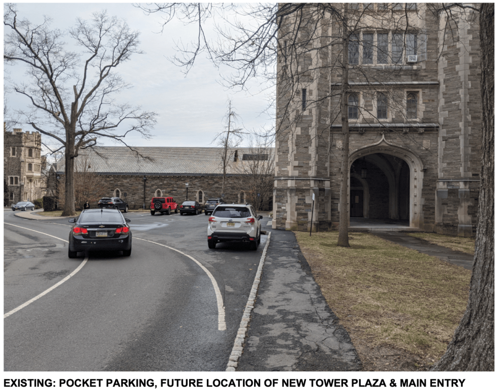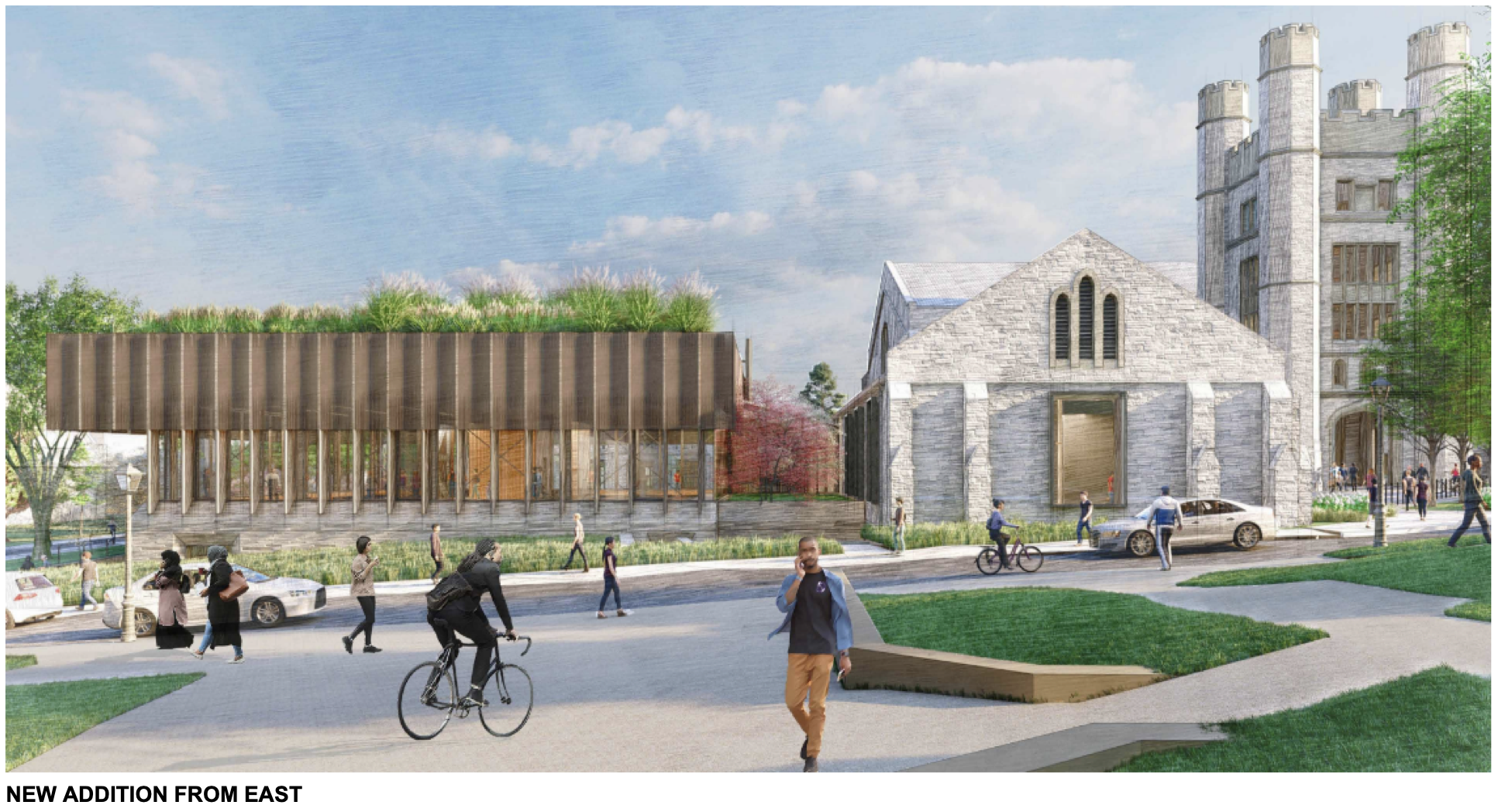 In addition to the new entranceway, Princeton University is proposed to construct a new two-story addition on the south side of Dillon Gymnasium. The new structure would support improved fitness amenities, and the surrounding area would be repaved and landscape for recreational uses, including “basketball, outdoor exercise, and informal gathering”. To make space for these uses, a bunch of existing modular utility buildings will be cleared from the site. New trees, shrubs, and grasses would be installed around the perimeter of the site to provide seasonal interest to passing pedestrians.