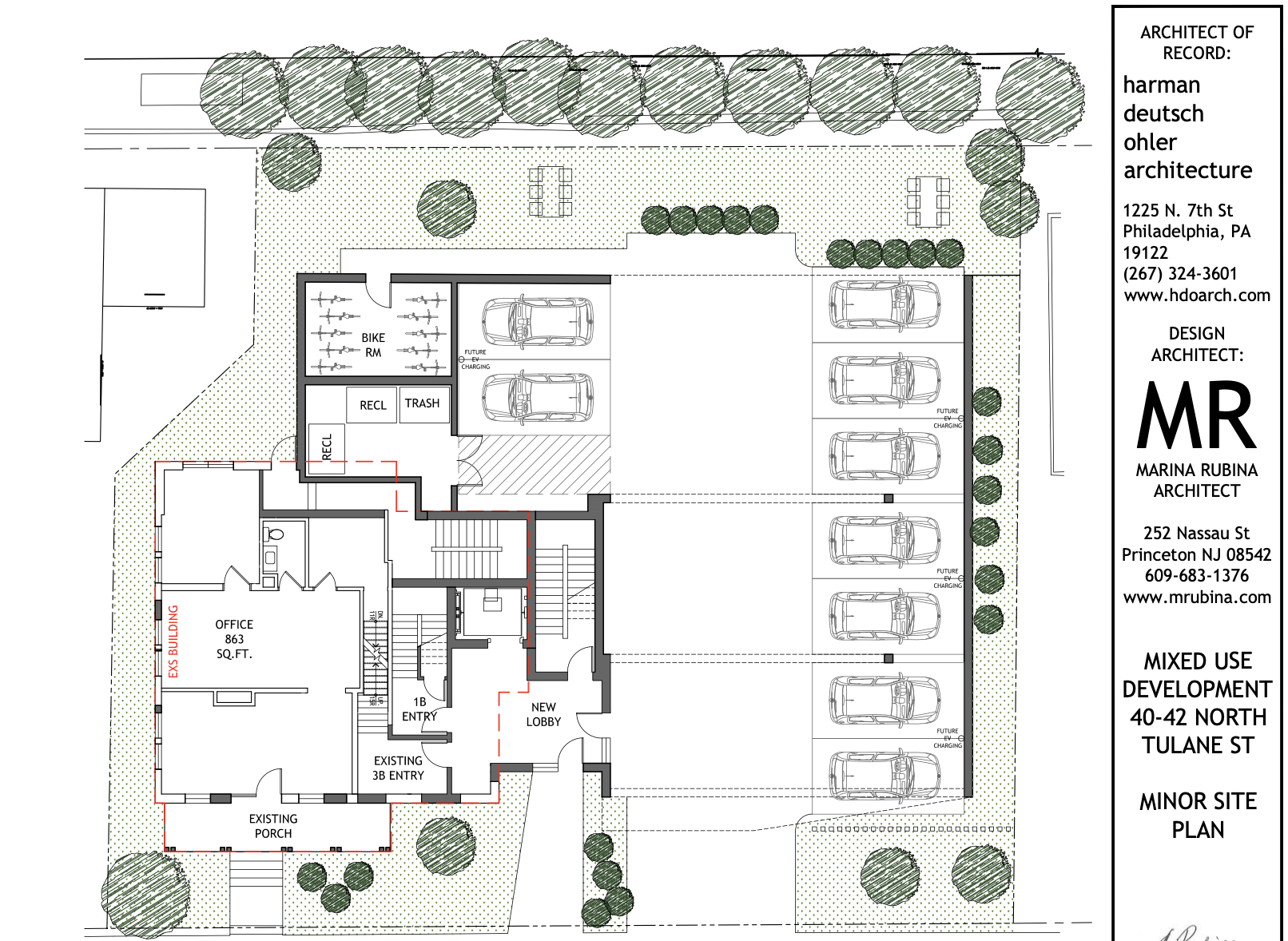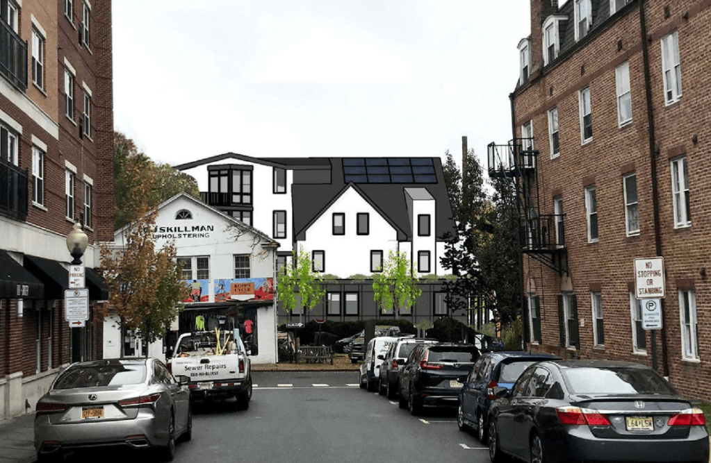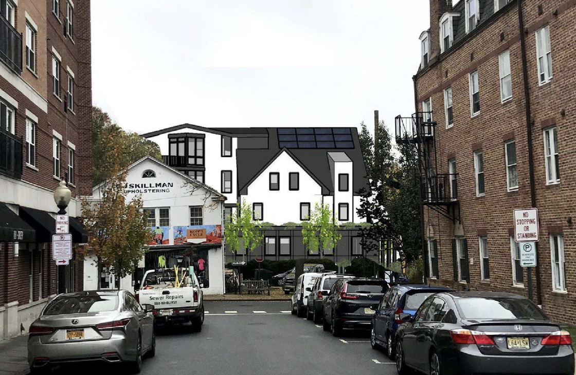 If approved, the redevelopment at 40-42 North Tulane St would create three new affordable homes in the heart of downtown Princeton. These affordable units would be provided under a set-aside rule in Princeton zoning. The remaining 11 units would be made available at market rates. There would also be 2,500 sq ft of ground floor commercial space. As part of the affordable housing overlay at this location, there is increased flexibility about the amount of parking which must be provided. Existing parking garages at the rear of the property (visible in the image above) would be demolished, and nine new parking bays serving the site would be provided on the ground floor of the new structure. A covered ‘bike room’ would also be available on the ground floor.