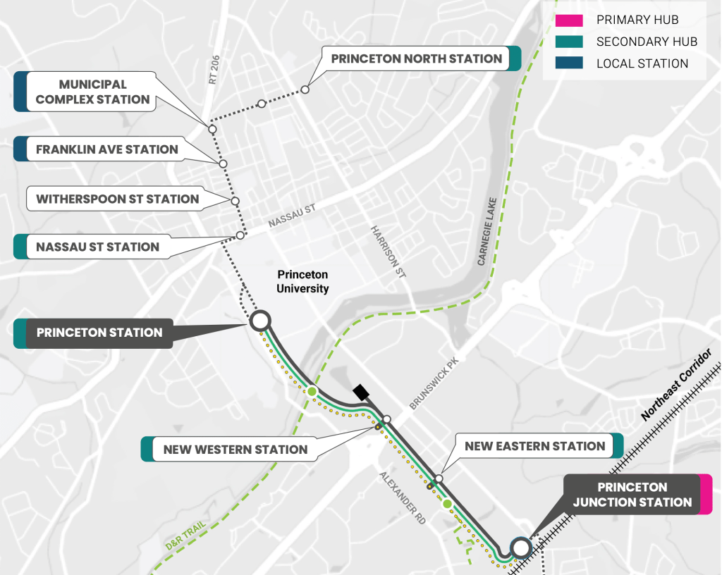 NJ Transit today released a final report from their study of transit alternatives along the Princeton ‘Dinky’ rail corridor. The study, which began in spring of 2021, was intended to identify what the best options are for providing future transit service between Princeton and Princeton Junction. A branch rail line currently runs from Princeton Station to Princeton Junction Station, connecting with main line rail services (link to map). The rail line mostly runs through Princeton University property north and south of the D&R canal and Carnegie Lake.