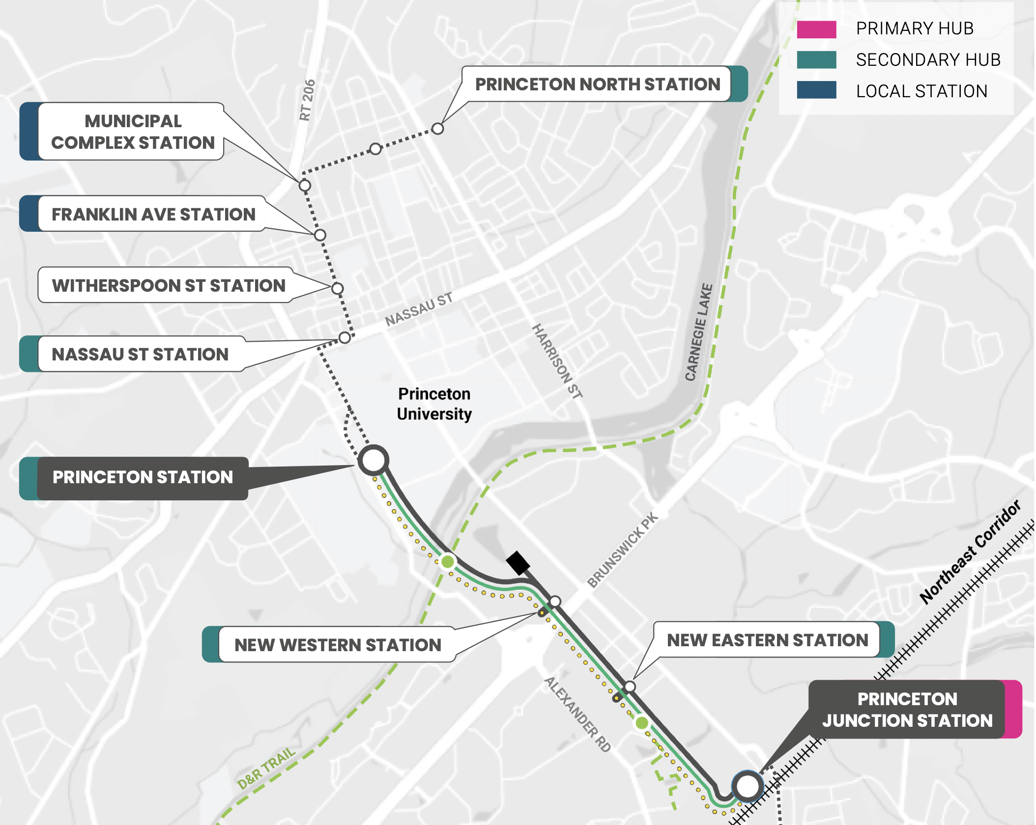 The final study report provides a little more detail on new stations for a potential future Dinky light rail service. A new ‘Western Station’ would provide access to areas north of US-1 (Brunswick Pike) including the residences along Canal Pointe Boulevard, and potential future intercept parking lots or transit-oriented devleopment east of Alexander Road. A new ‘Eastern Station’ would provide convenient access to office parks and employment centers located south of US-1 near Alexander Road.