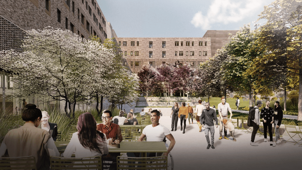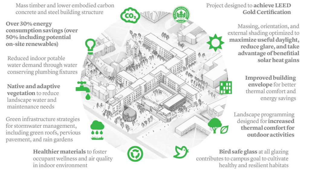 The new Hobson College will also demonstrate a range of advanced ecological considerations, with the goal of achieving LEED Gold certification. McCoy explained that the University had considered the possibility of attaining an even higher standard of energy efficiency (the ‘Passivhaus’ standard) but had ruled it out because it would take a thousand years for the additional materials required to provide a carbon saving relative to LEED Gold. He also justified the replacement of the existing First College buildings, saying that they had very poor energy ratings, and could also not feasibly be reused to achieve the goal of a truly connected college community. Throughout the site, there will be improved plantings, and features to reduce stormwater run-off.