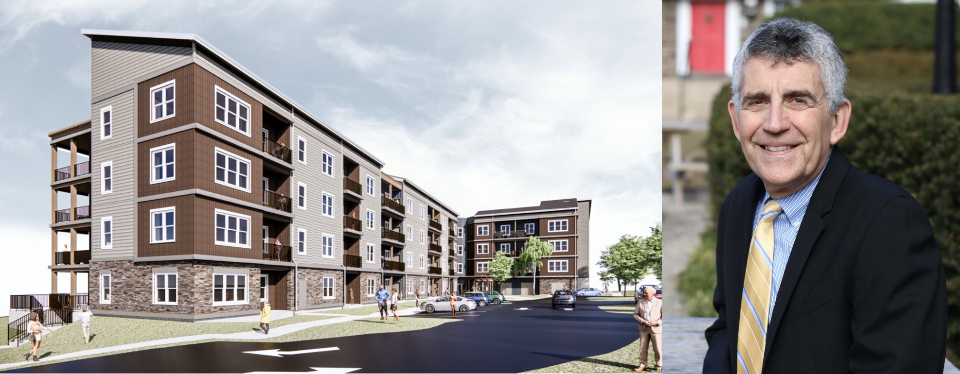 Left, affordable housing for seniors under construction as part of Princeton’s 2019 affordable housing settlement. Right, Princeotn Mayor Mark Freda. (images: princetonnj.gov)