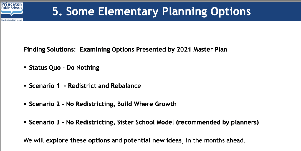 Princeton Public School District is considering a major restructuring of elementary school education. At a meeting of elementary school parents on April 27, district official presented a number of options to address growing student enrollment. One of these options would be to move to a ‘Sister Schools’ model, where students would attend one elementary school for kindergarten through Grade 2, and then switch to a different school for grades 3-5.