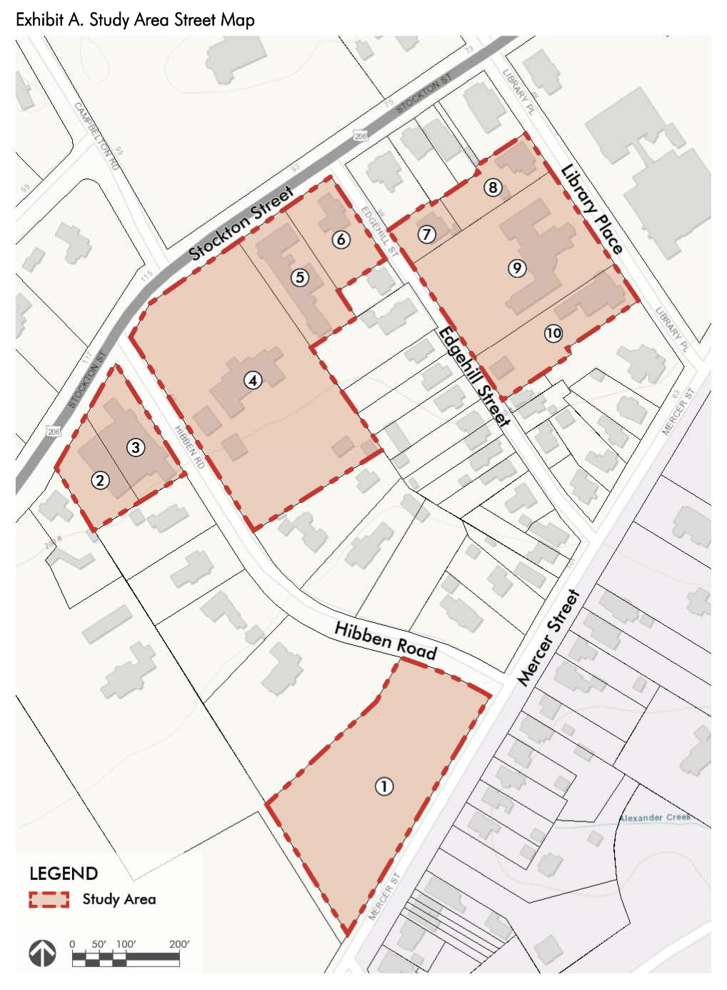 In a classic example of “speak softly, but carry a big stick”, the would-be developer of the former Princeton Seminary Tennent-Roberts site off Route 206 has laid down a threat to neighbors who have blocked previous efforts for redevelopment: if they can’t cut a deal about what to build, they may sue the town. And they think they will win. The case involves 10 acres of land that was designated as a redevelopment area by Princeton Council in 2018. These acres are off of Stockton Street (aka State Road 206) around Library Place, Edgehill Street, and Hibben Road (map). The land is about 10 minutes walk from downtown Princeton, making it an extremely attractive area for “Smart Growth” redevelopment.