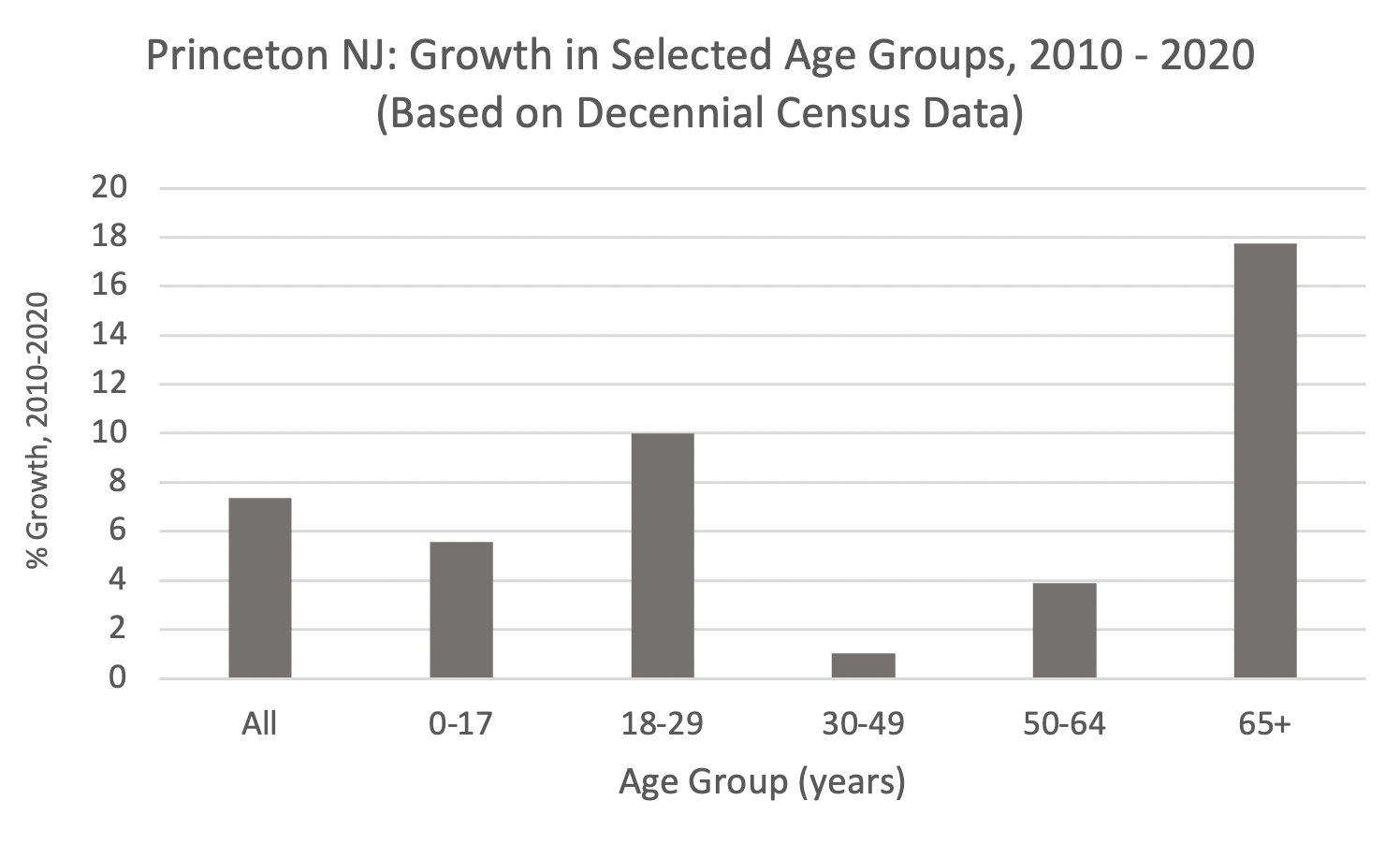 In comparison, the number of Princeton residents in early middle-age (aged 30-49) barely budged betwen 2010 and 2020. Among people in late middle-age (50-64), there was a slight uptick of +3.9%. But the group that showed the biggest percentage increase leading into the last Census was the population of over-65s. Their number grew by +17.7%, far greater than the growth of any other age group. The Census figures strongly suggest that the growth in the population of the town is being driven largely by the expansion of Princeton University, and by seniors who are choosing to stay in or move to Princeton.