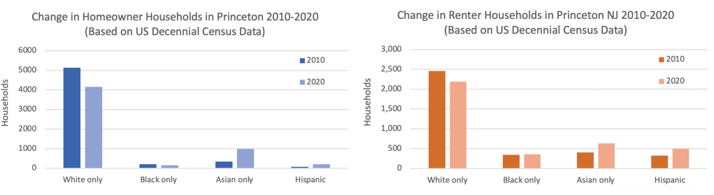 What about other demographic changes in Princeton? The latest Census data provides information on the racial background of homeowners and renters in Princeton. By considering only the occupants of the town’s 9,373 occupied housing units, we can mostly exclude students, who typically live in ‘group quarters’, which are categorized separately for Census purposes. In 2020, the town of Princeton had 5,363 homes that were owned by the residents, and 3,739 rented homes.