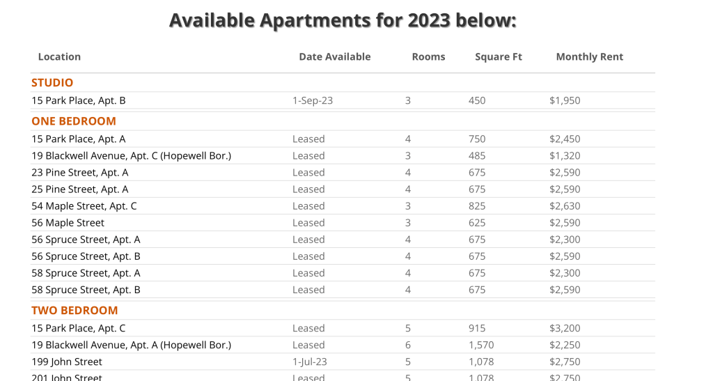 Nassau Street Properties offers older apartment buildings in central Princeton, which are sometimes available at lower price points. According to their most recent online price list, 1-bedroom apartments in Princeton start at $2,300 / month. In most cases, prices of these apartments have gone up about 5% – 10% since last year.