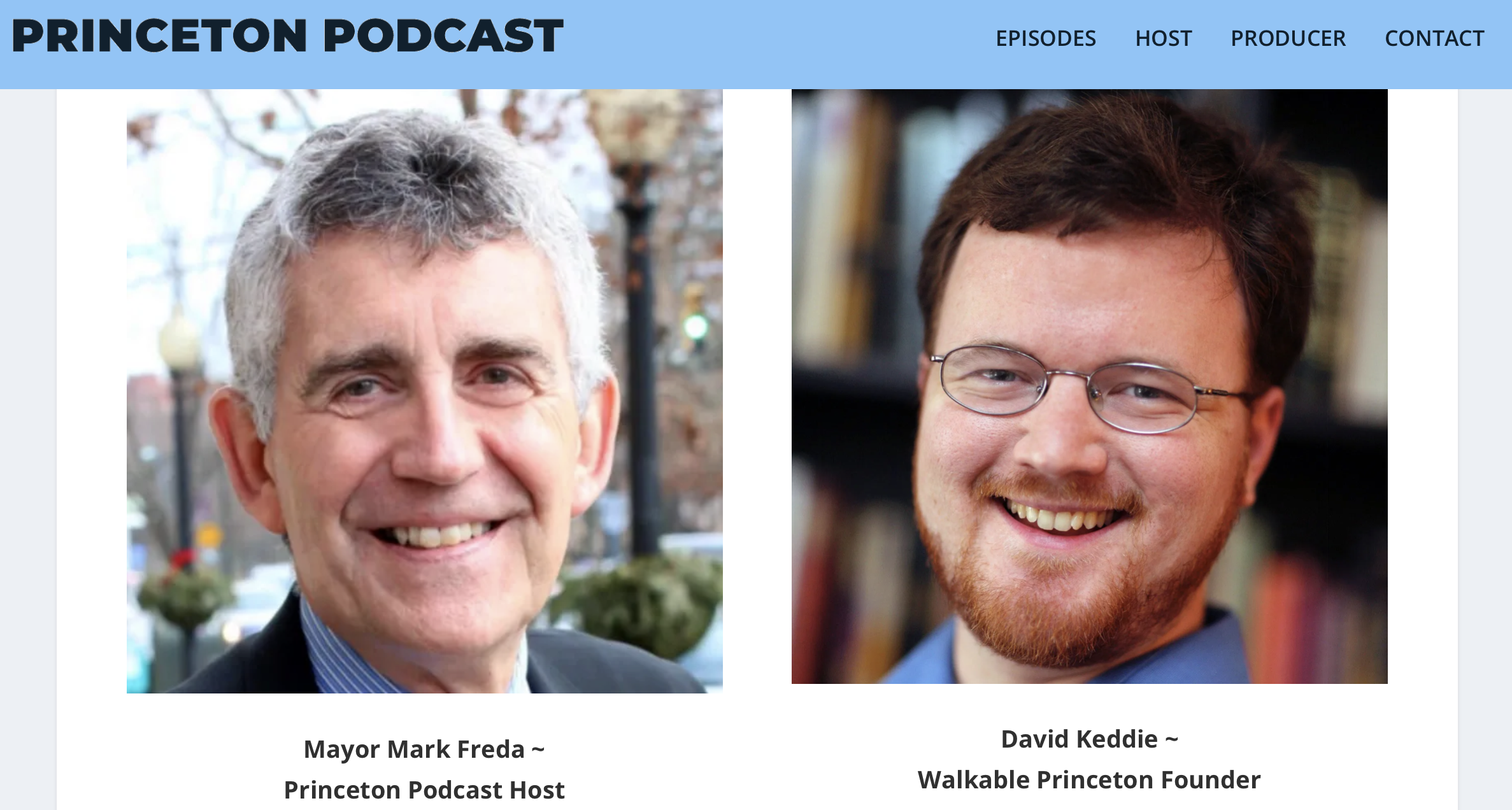 Earlier this year, David Keddie, founder of ‘Walkable Princeton’ founder was invited to join Mayor Mark Freda on Episode 42 of “The Princeton Podcast”. The regular recordings are a way for Mayor Freda to talk to different members of the community and hear from Princeton residents who “contribute their time and talent to our culturally diverse and historically rich community”. David and Mayor Freda had the chance to discuss many of the ideas that inform the ‘Walkable Princeton’ group, including Smart Growth, housing affordability, and environmental sustainability.