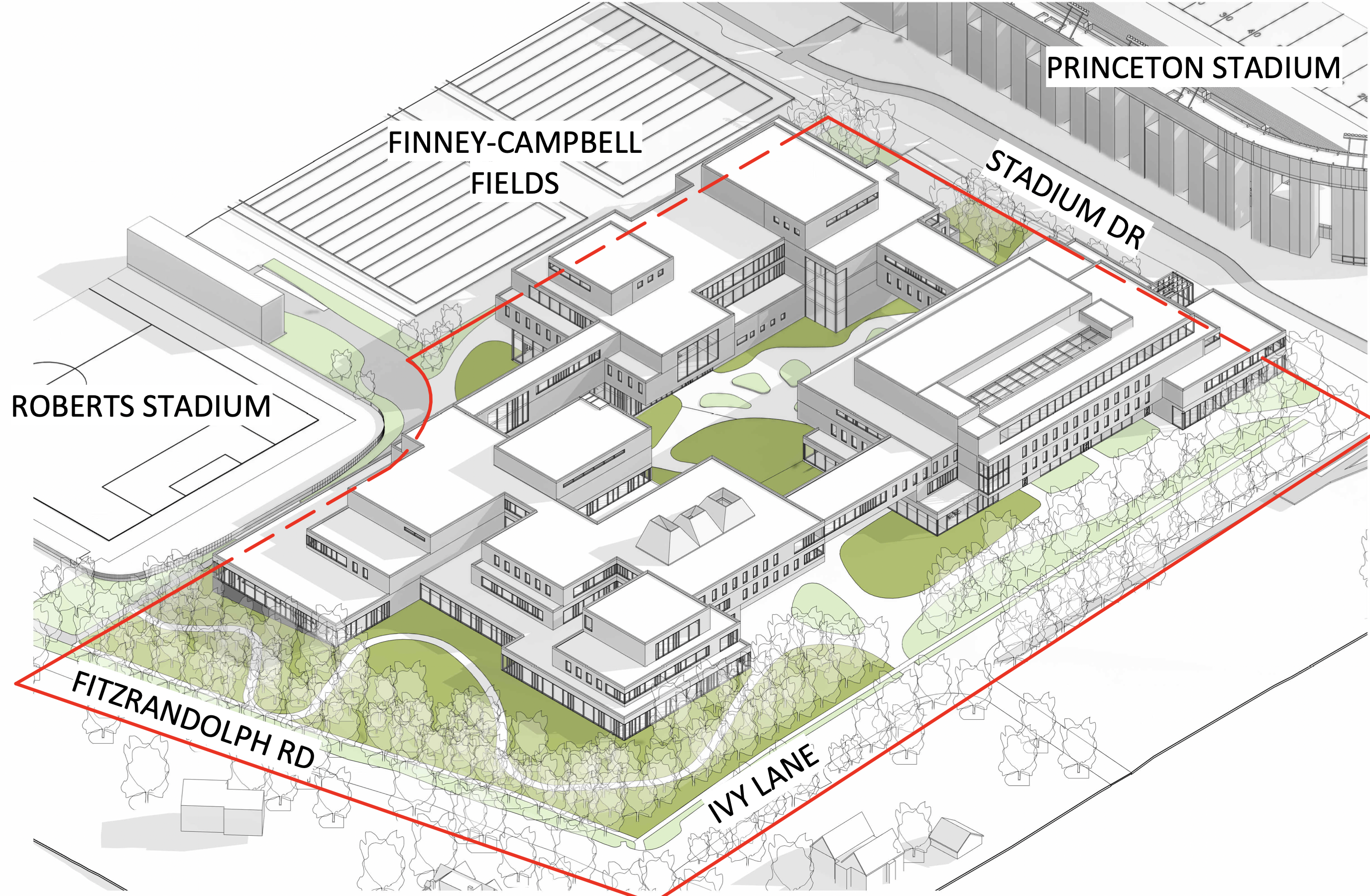 Princeton University has signaled its intention to continue the expansion in the so-called ‘East Campus’ neighborhood near the Princeton Stadium. Based on a new ‘concept plan’ submitted to the Princeton municipal planning department, the University envisions a substantial new complex that will be called the ‘Quantum Institute’. The new Institute will be on Ivy Lane, between Fitzrandolph Road and Stadium Drive (map).