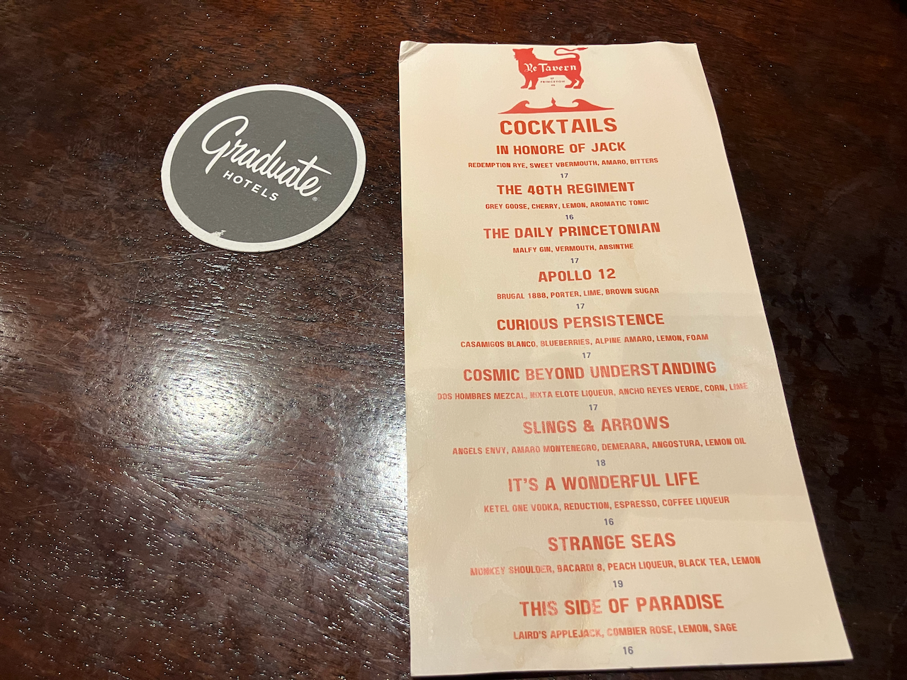 The first site plan for the Graduate Hotel was submitted in 2020 (Report: “Renderings of Proposed 20 Nassau Street Hotel in Downtown Princeton“). The lengthy construction made members of the town council irate, because Chambers Street was partially closed to traffic for an extended period. Several businesses were also displaced during construction. But now that the hotel is open, it’s clear that it is going to be a landmark in the town. The fittings are unique and reflect the town’s history and character. The bar staff are knowledgeable and vivacious. The name of every cocktail contains a subtle reference to some aspect of Princeton history. Some of these cocktails were tested as part of the thorough research for this article and they are extremely good!