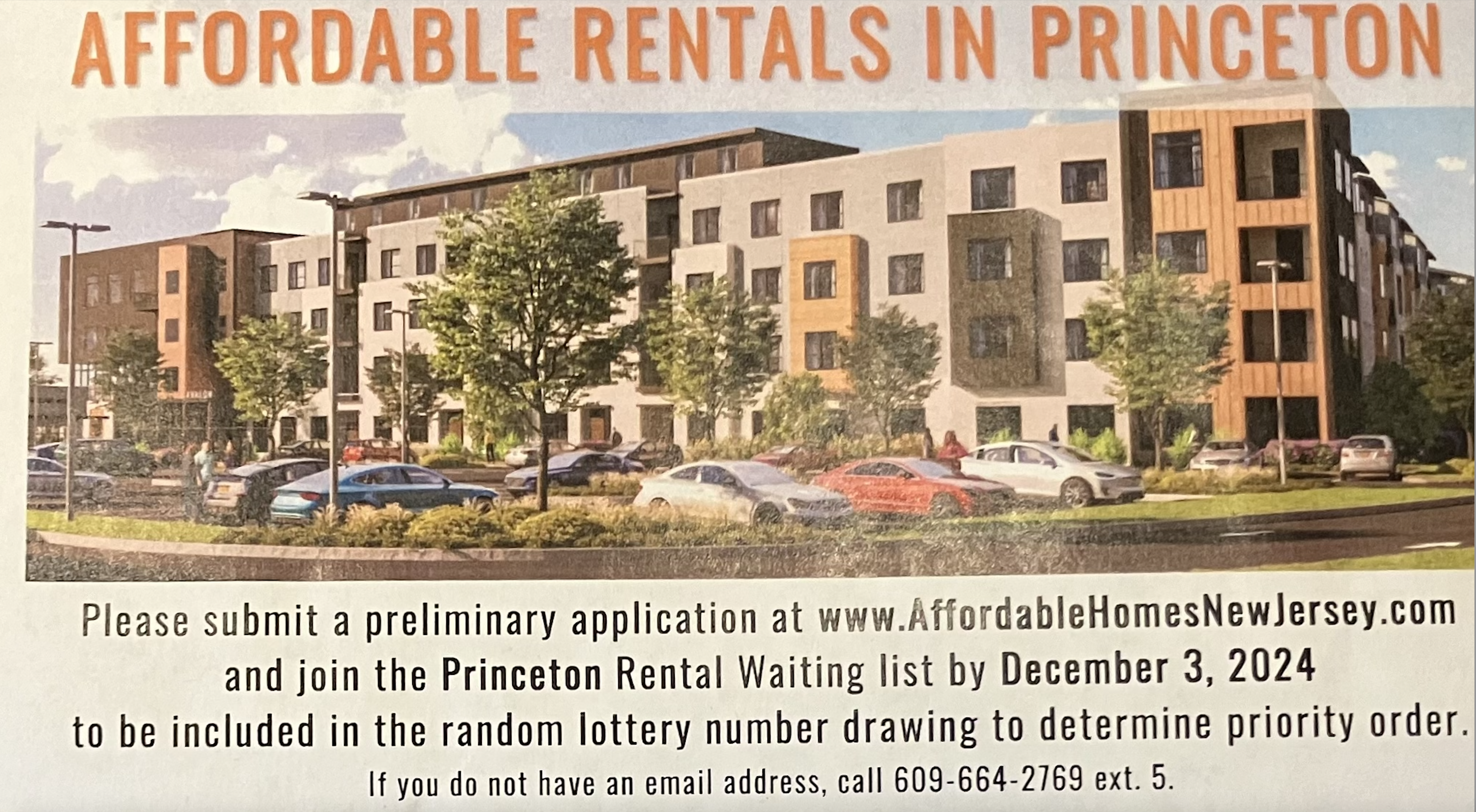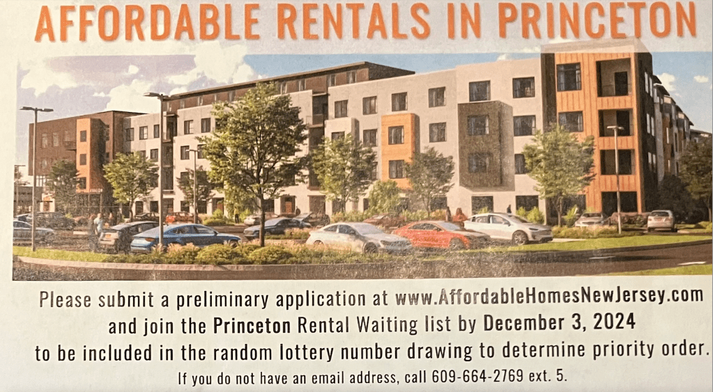One example of a new affordable housing housing development in Princeton is the ‘Avalon Princeton at Harrison’ apartment building, which is approaching completion at the Princeton Shopping Center (see image at top). People who want to apply for one of the affordable units in this development have until December 3 to get their name on the waiting list. This apartment building was constructed as part of the town’s 2019 settlement to meet state affordable housing regulations. 20% of the homes in the building will be affordable units, with the rest renting at regular market rates.