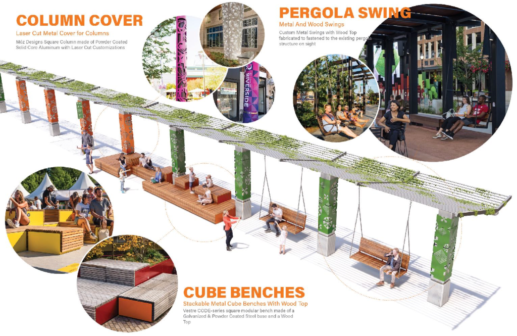 New seating in Hinds Plaza would be moveable, like the existing tables and chairs, but the new design would also feature some new ‘sculptural seating’, which Ribaudo said was similar to that used in the pedestrian mall in Division Street, in Somerville NJ. The total amount of seating in the plaza would increase. Ribaudo also had some specific ideas for the ‘pergola’ on the far side of the plaza. The overgrown wisteria on the pergola would be cut back, and the pillars would be re-clad with a material that would allow new art installations. A ‘pergola swing’, as shown in the image below, would allow plaza users to swing as they rested in the square.