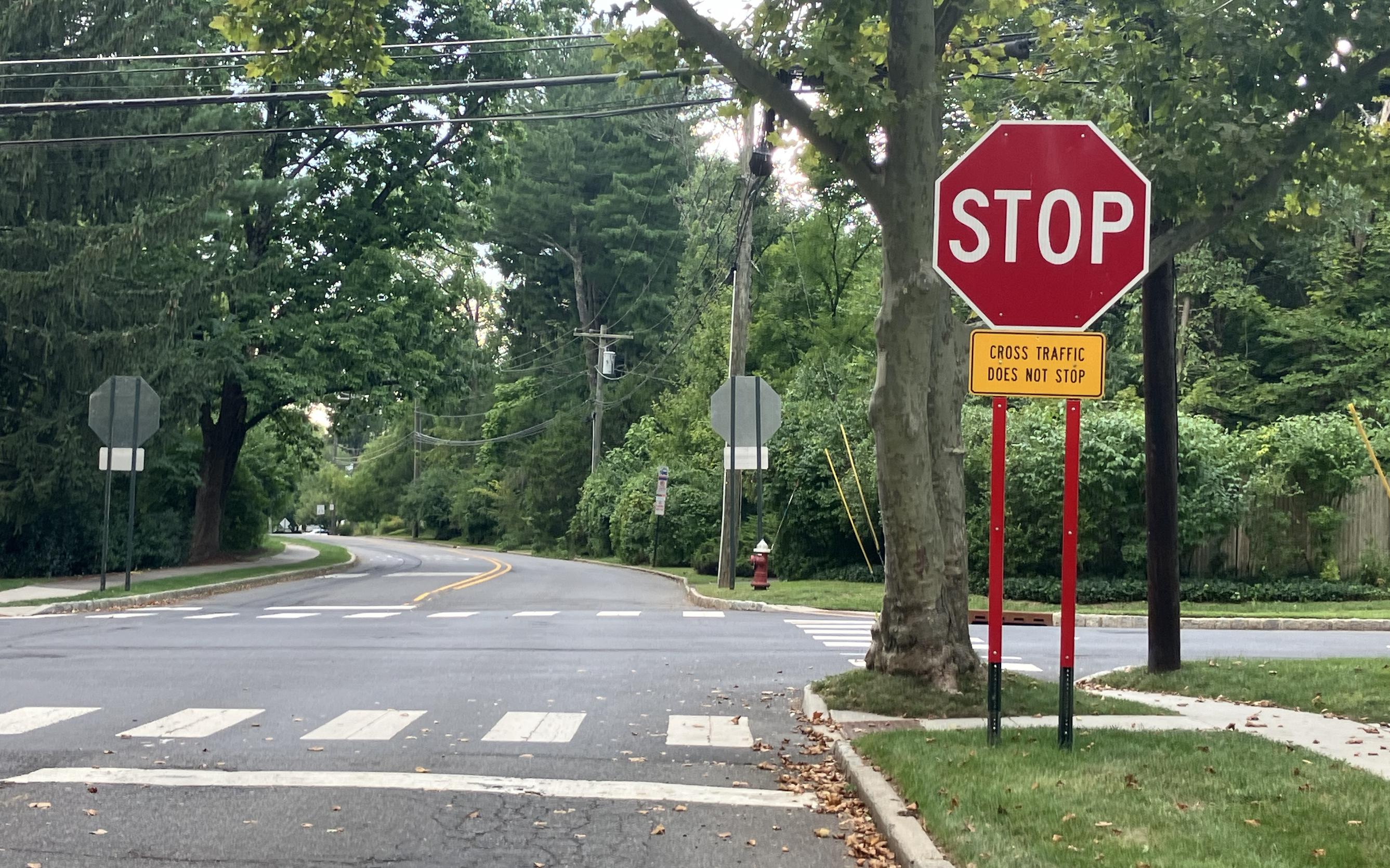As noted in a memo from the municipal engineers, the town has previously tried a number of different measures to remind drivers on Terhune Road that they have to stop. These have included adding ‘rumble strips’ on the road on the approaches to the intersection, adding gigantic highway-sized Stop signs on both sides of the road, and more signs saying “Cross Traffic Does Not Stop”. The difference between the intersection today and what it was like in years gone by is visible in past photos published on ‘Walkable Princeton’ (Report from 2016: Princeton Traffic Calming Now Comes With Extra Rumble Rumble).