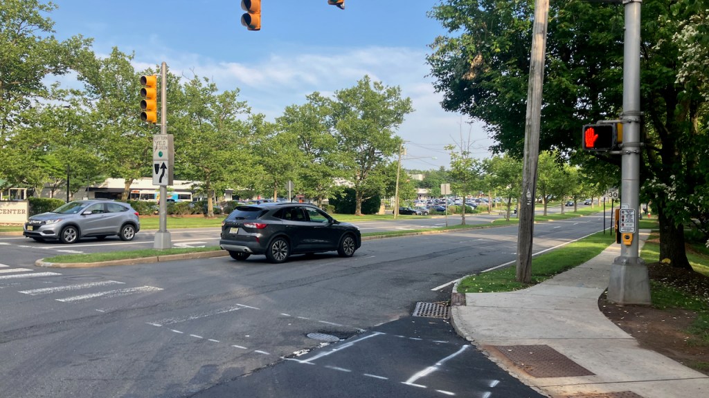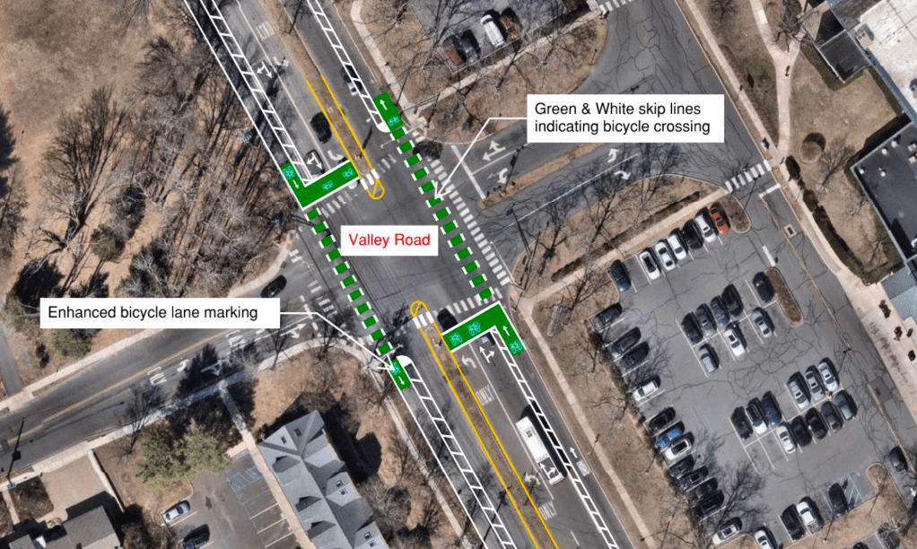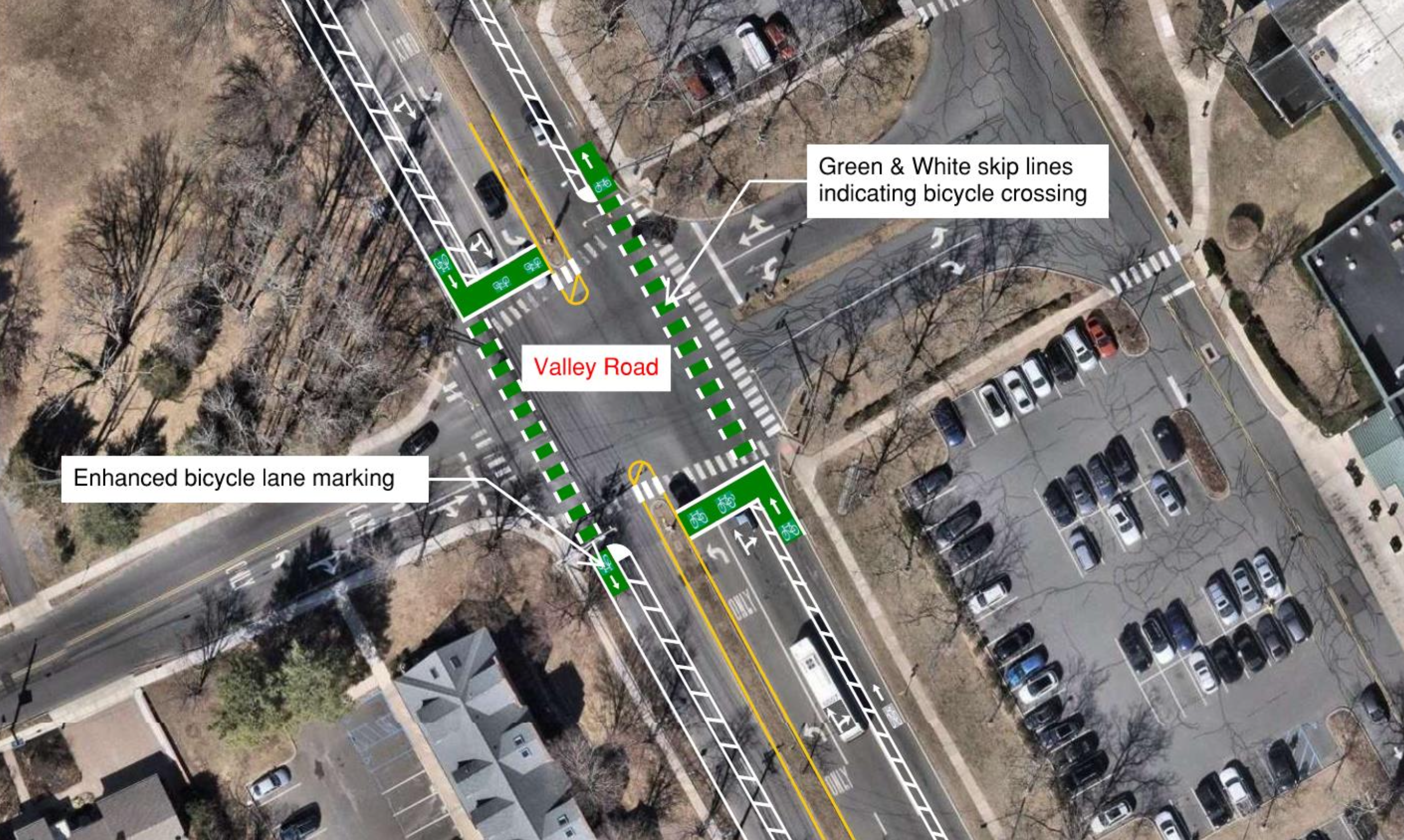 In addition to the bike lanes, North Harrison Street will get ‘bike boxes’ at intersections, which are green areas where cyclists can wait ahead of traffic, and which make it easier for bicyclists to make turns. The pedestrian island at the intersection of North Harrison Street and Valley Road will also be extended, to make it easier for walkers to cross near the entrance to the Princeton Shopping Center. the new bike lanes on North Harrison Street will connect to bike lanes that are being installed on Terhune Road to the north (Report: “Terhune Road Construction Begins to Add Bike Lanes, New Paths“).