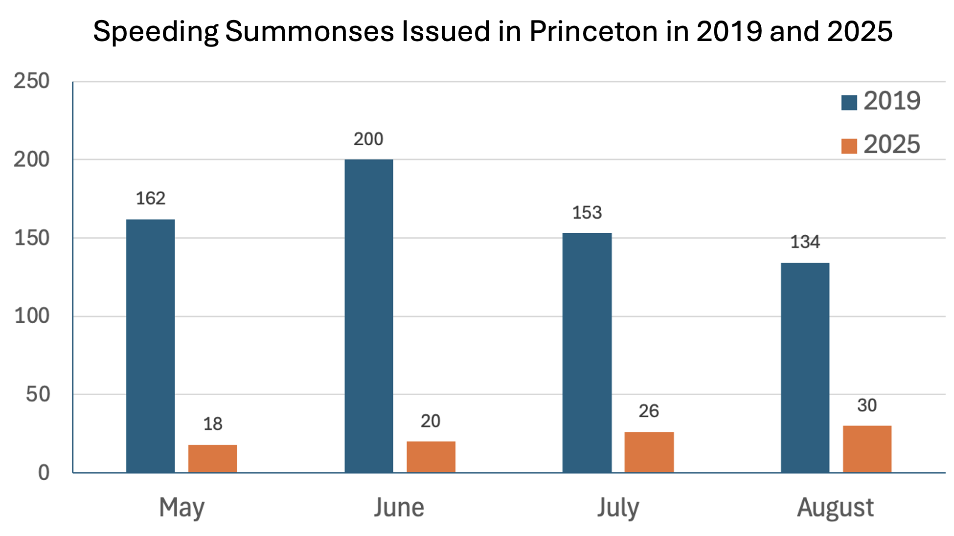 According to Princeton Police, 162 summonses for speeding were issued in May 2019. The equivalent figure for May 2025 was 18. The police also reported that 200 summonses for speeding were issued in June 2019. The equivalent figure for June 2025 was just 20. Massive drops in the number of speeding summonses are also clearly reported for the months of July and August, when comparing the figures from 2019 to those from 2025.