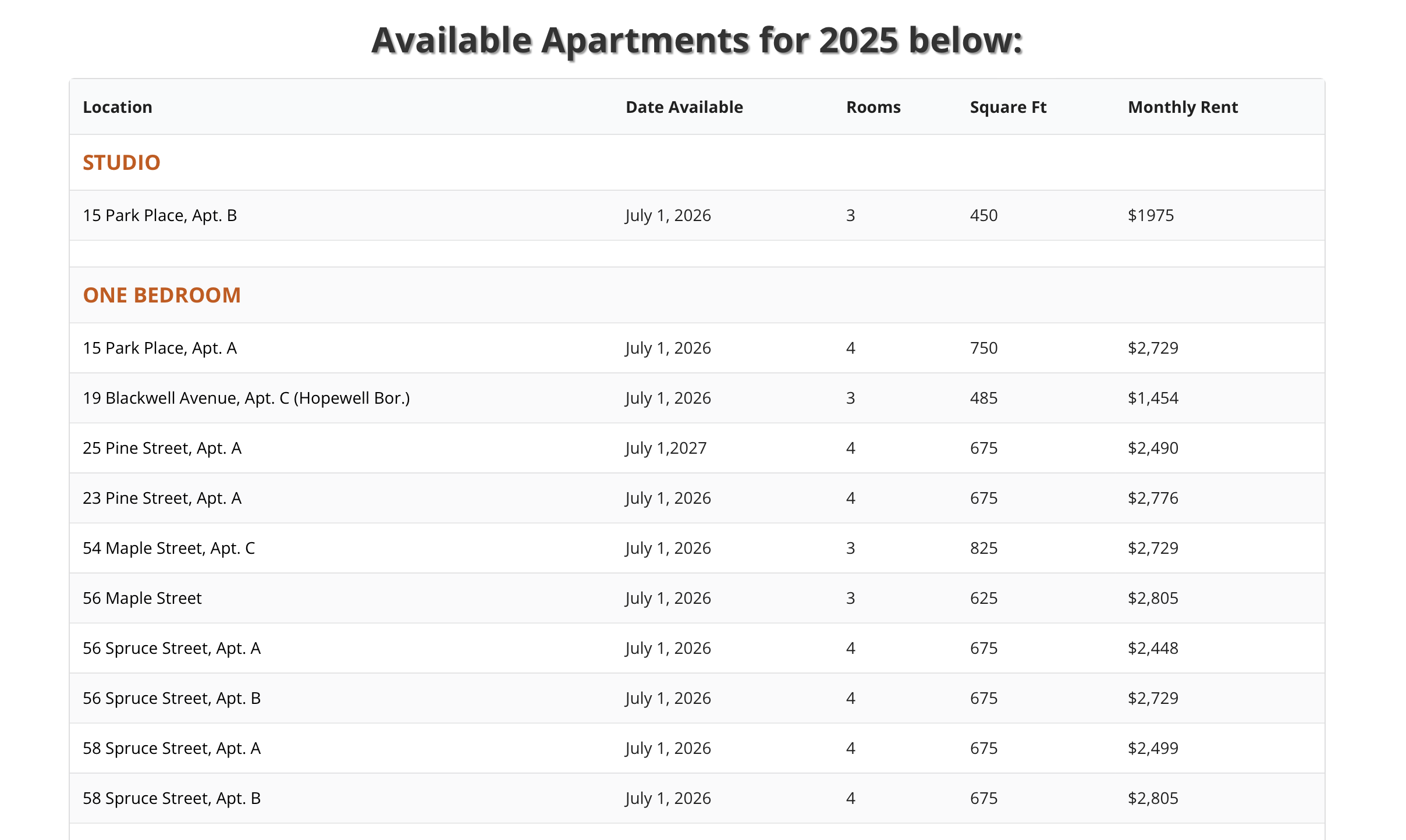 Nassau Street Properties has updated rates for their available properties for the coming year. These apartments are typically in older buildings but can offer good value as they are often located in walkable neighborhoods in the heart of Princeton. Their average rate for one-bedroom apartments in Princeton, as shown below, is $2,667 / month. That is actually lower than the equivalent figure for 2024, which was $2,713 / month. Some of the units are advertised as a lower rate now compared to at the same time last year. Other units have increased in price by a relatively small amount.