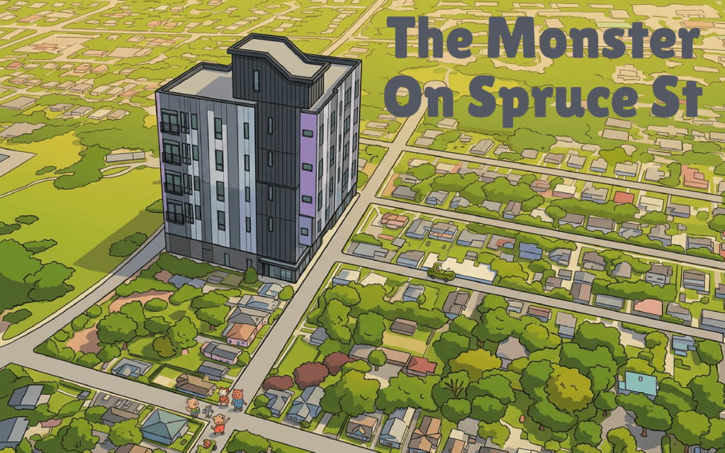 The lawsuit lays out a catalog of complaints that are discussed further on a website, launched by Wolf, which aims to rally neighbors to the cause. The website describes the proposed redevelopment as “The Monster on Spruce Street”, and is illustrated by an entirely fictitious graphic showing a five-story building towering over a neighborhood that resembles Princeton’s Tree Streets.