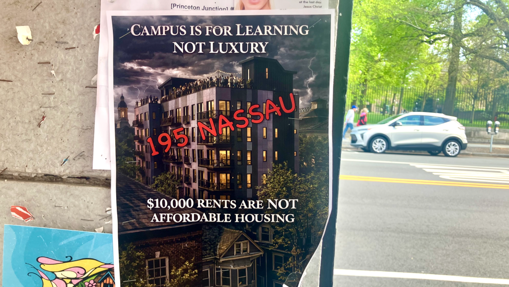 It’s not clear who placed the posters complaining about the $10,000 rents at 195 Nassau. The posters have no website, email address or other identifying feature. Instead, there is an AI-generated image of the apartment building, with a massive party on the roof deck, against a thunderous background. A cupola resembling that of Nassau Hall appears behind the building, even though the real Nassau Hall is at least 1/4 of a mile to the west of the site.