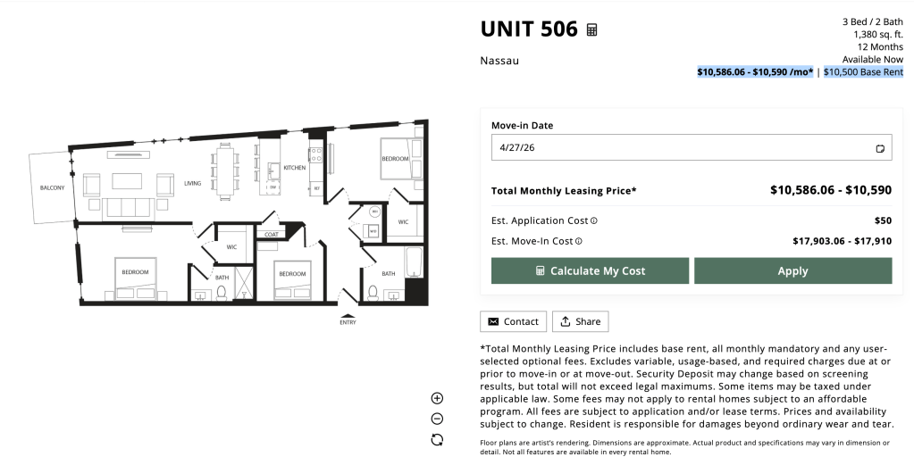 More recently, rental rates for the remaining 38 units in the building have been published at the 195 Nassau website. These market-rate units start at $4,700 per month for a 1-bedroom unit, rising to $10,500 per month for 3-bedroom, 2- bathroom apartments on the top floor. That top figure of $10,500 per month matches the rate mentioned on the posters on the information kiosk.